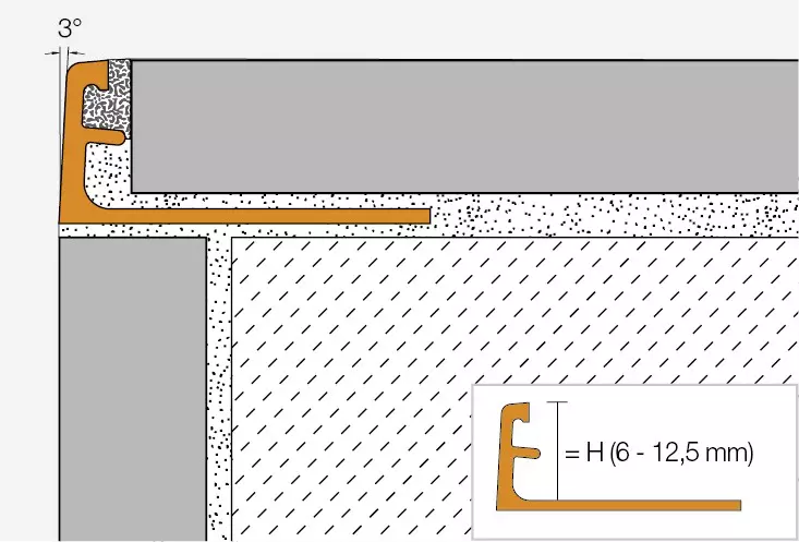 - Dzięki odcieniowi Aluminium z powłoką strukturalną jasny antracyt profil doskonale komponuje się z podłogą i ścianami, tworząc estetyczne przejście między powierzchniami.