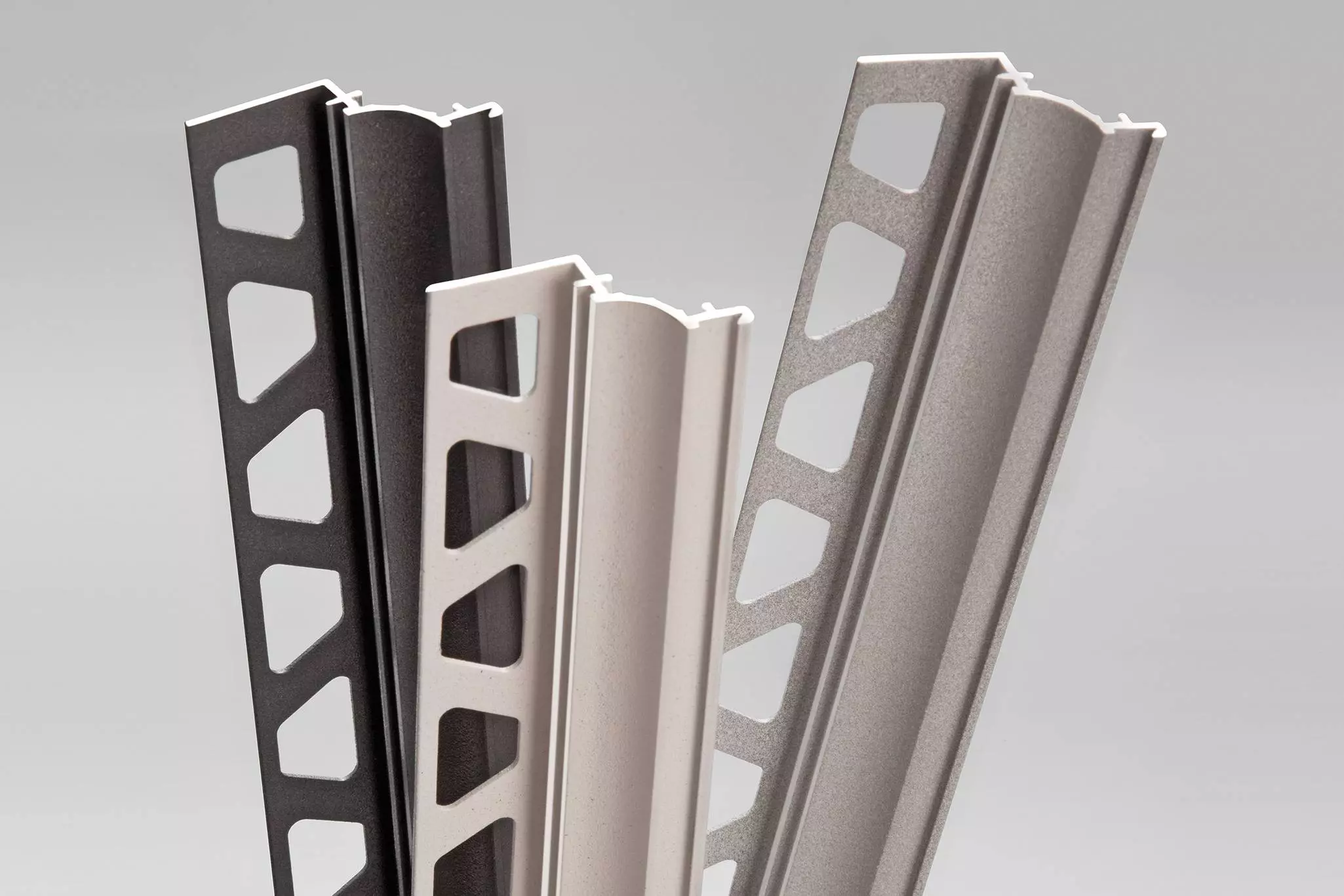 - Dzięki odcieniowi Aluminium z powłoką strukturalną kość słoniowa profil doskonale komponuje się z podłogą i ścianami, tworząc estetyczne przejście między powierzchniami.