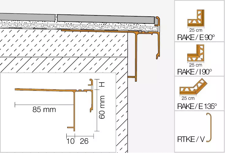Schlüter-BARA-RAKE/E 90° i BARA-RAKE/E 135° to narożniki zewnętrzne, a BARA-RAKE/I 90° to narożniki wewnętrzne. Do zakrywania krawędzi styków między profilami zaleca się użycie Schlüter-BARA-RTKE/V.