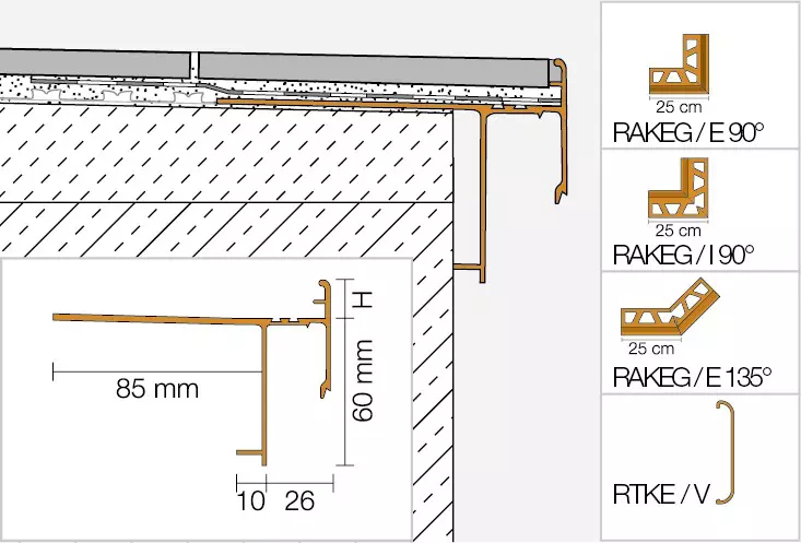 Schlüter-BARA-RAKEG/E 90° i BARA-RAKEG/E 135° to narożniki zewnętrzne, a BARA-RAKEG/I 90° to narożniki wewnętrzne. Do zakrywania krawędzi styków między profilami zaleca się użycie Schlüter-BARA-RTKE/V.