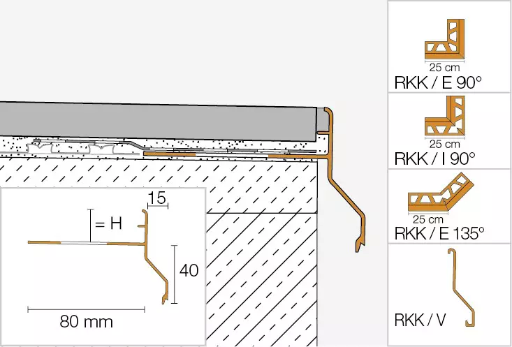 Schlüter-BARA-RKK/E 90° i BARA-RKK/E 135° to narożniki zewnętrzne, a BARA-RKK/I 90° to narożniki wewnętrzne, wszystkie z kątem odpowiadającym ich nazwie. BARA-RKK/V to systemowe łączniki do zakrywania styków między profilami.
