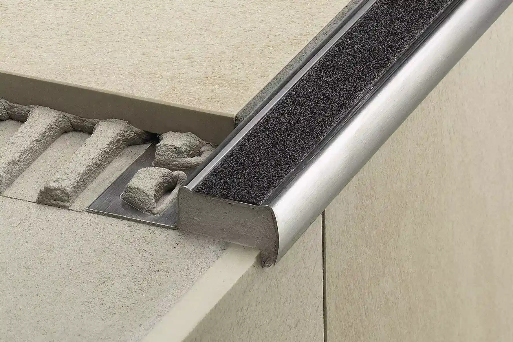 Schlüter-TREP-G i -GL to profile schodowe z antypoślizgową wkładką, wykonane ze szczotkowanej stali nierdzewnej, przeznaczone do zabezpieczania krawędzi stopni schodowych pokrytych różnymi materiałami okładzinowymi. Są one zarówno estetyczne, jak i zapewniają bezpieczeństwo użytkownikom schodów.