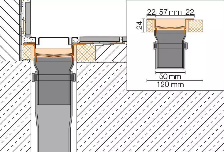 Schlüter STRKLV50GSE50 Kompletny zestaw odwodnienia liniowego z pionowym odpływem KERDI-LINE-V Stal nierdzewna - 500 mm - 120 mm - 22 mm - 1.5 mm