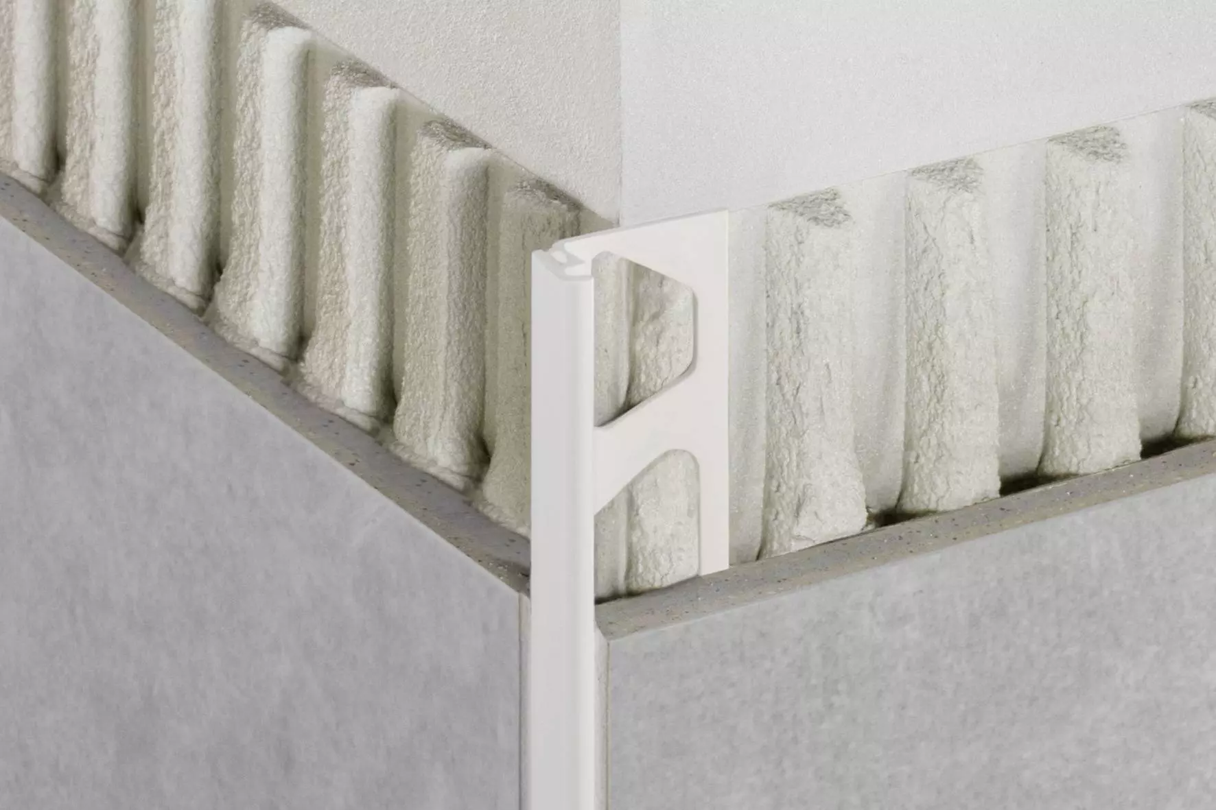 Schlüter-JOLLY-P to dekoracyjny profil zakończeniowy z kątem 90° z barwnego PCV do zewnętrznych naroży ścian pokrytych płytkami, zapewniający estetyczne zakończenie okładzin oraz ochronę krawędzi płytek przed uszkodzeniami mechanicznymi. Dzięki umieszczonym po obu stronach ogranicznikom spoiny możliwe jest wykonanie zdefiniowanych spoin przy płytkach.