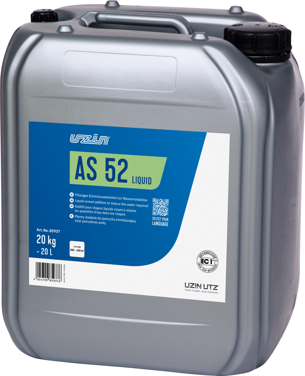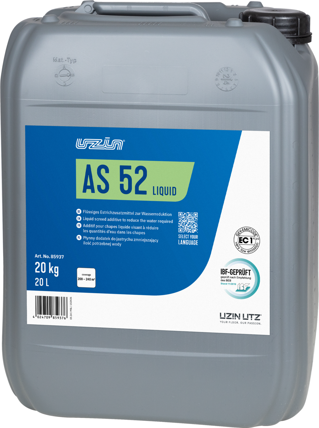 Płynny dodatek do jastrychów skracający czas oczekiwania na osiągnięcie gotowości do układania okładziny zmniejsza zapotrzebowanie na wodę o maks. 25% skraca czas oczekiwania na uzyskanie gotowości do układania okładzin zmniejsza naprężenia i skłonność do spękań po 5 dniach możliwość wygrzewania podłogi ma działanie plastyfikujące Zastosowanie Główny obszar stosowania: Płynny dodatek do jastrychów wykonywanych wg DIN 18560-1 do redukcji zapotrzebowania na wodę jastrychów cementowych i skrócenia czasu oczekiwania na osiągnięcie gotowości do układania okładziny. Właściwości UZIN AS 52 Liquid to wysoko skuteczny dodatek do wykonywania jastrychów cementowych o skróconym czasie oczekiwania na uzyskanie gotowości do układania okładzin. Zmniejsza zapotrzebowanie na wodę zarobową o aż do 25% oraz skłonność do występowania szkodliwych wykwitów. Poprawia właściwości stosowania zaprawy jastrychowej oraz minimalizuje skłonność do powstawania spękań w utwardzonym jastrychu. Do wewnątrz i na zewnątrz.