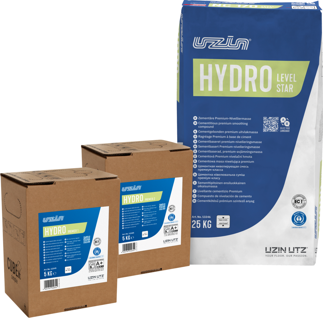 System do jastrychów cementowych do odcinania wilgotności resztkowej. odporność na wilgotność alkaiczną grunty gotowe do użycia łatwe, ergonomiczne zastosowanie preparatów gruntujących przy pomocy wałka szybkie schnięcie, preparatów gruntujących ekstremalnia dobra rozpływność masy szpachlowej bardzo gładka powierzchnia mas szpachlowych Zastosowanie System UZIN HydroBlock do nieogrzewanych jastrychów cementowych o wilgotności szczątkowej do 5% CM ( na jastrychach cementowych z ogrzewaniem podłogowym do 2,5% CM.) Działanie izolujące wilgoć jest skuteczne wyłacznie w przypadku wykonania konstrukcji systemowej (UZIN Hydro Primer 1 i 2, UZIN Hydro LevelStar). Do stosowania pod wykładziny elastyczne i tekstylne, a także pod parkiety wielowarstwowe. Pod wykładziny elastyczne, tekstylne oraz pod podłogi wielowarstwowe