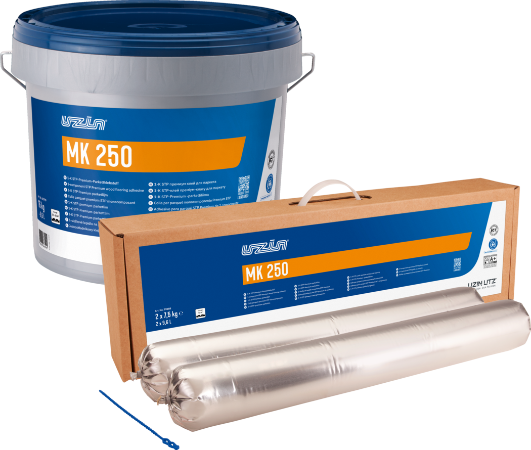 Twardy, odporny na ścinanie klej o długim czasie otwartym do układania wszelkich rodzajów podłóg drewnianych. bardzo dobra stabilność spoiny wysoka siła zasysania klej twardy zgodnie z ISO 17 178 UZIN MK 250 T do zastosowania z UZIN ATD 100 nie zawiera substancji zmiękczających zabrudzenia klejem dają się łatwo usunąć z parkietu Zastosowanie Główny obszar stosowania: deski lite i wielowarstwowe parkiet lity Rozszerzony zakres stosowania: mozaika (8 mm parkiet lity) parkiet przemysłowy parkiet wielowarstwowy bruk parkietowy (po zasięgnięciu porady technicznej) drewno egzotyczne (po zasięgnięciu porady technicznej)