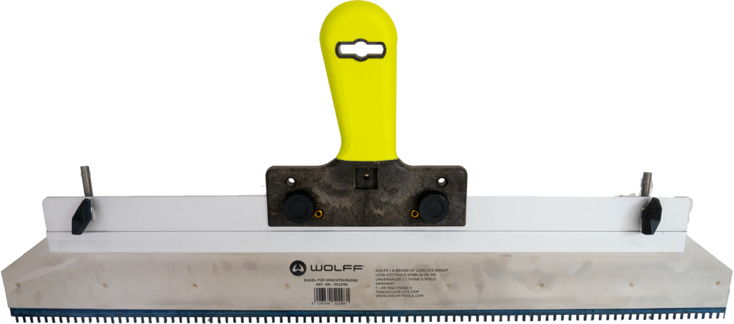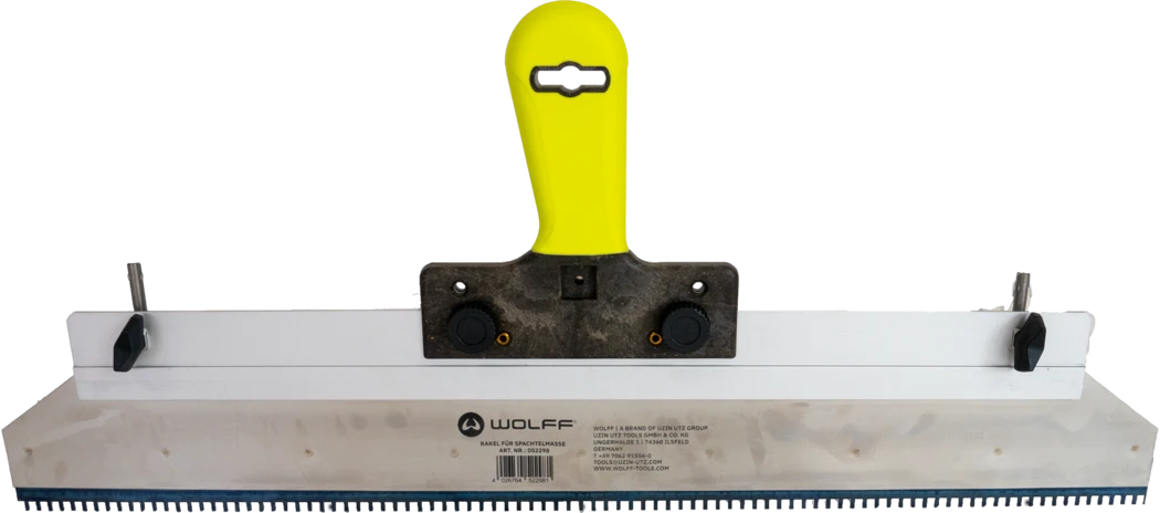 Do nakładania niwelujących mas szpachlowych Właściwości Do pracy na stojąco z uchwytem na kij np. teleskopowy Szerokość robocza 56 cm Wraz z wkładem rakli R2 Uzębienie R1, R2 i R3