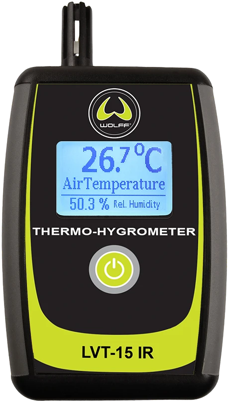 Pomiar temperatury powietrza i wilgotności względnej powietrza Właściwości Obliczanie punktu rosy Pomiar temperatury powierzchni bez dodatkowego czujnika poprzez wbudowany czujnik podczerwieni Alarm optyczny i akustyczny przy różnicach temperatury Dane techniczne: Zasilanie: zasilanie bateryjne, 2 x AA 1,5 V Wymiary: 146 x 79 x 26 mm (wys.×szer.×gł.) Wyświetlacz: monochromatyczny z podświetlaniem tła Rozdzielczość 128 x 64 pikseli Zakres temperatury pracy: 5stC – 40stC < 80% względnej wilgotności powietrza bez kondensacji Dodatkowe informacje Miernik LVT 15 IR komplet baterii walizeczka ręczna